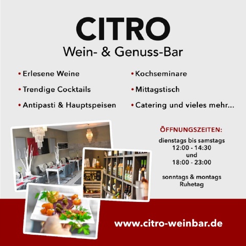 telefonisch unter 02173 6866633 oder 0157 73466692 www.citro-weinbar.de