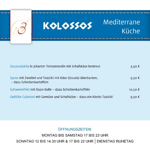 sonntag 12 bis 14.30 uhr & 17 bis 22 uhr | Dienstag ruhetag Solinger Str. 31 - +49 2173 / 1091213 - www.Taverna-kolossos.de