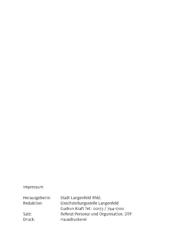 Impressum Herausgeberin: Stadt Langenfeld Rhld. Redaktion: Gleichstellungsstelle Langenfeld Gudrun Kraft Tel.: 02173 / 794-1700 Satz: Referat Personal und Organisation, DTP Druck: Hausdruckerei