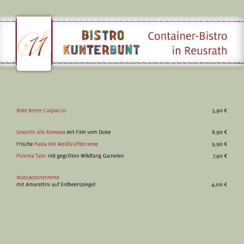 Gnocchi alla Romana mit Filet vom Duke 8,90 € Gruß aus dem Bistro Kunterbunt Dienstag bis Samstag: 14 bis 22 Uhr